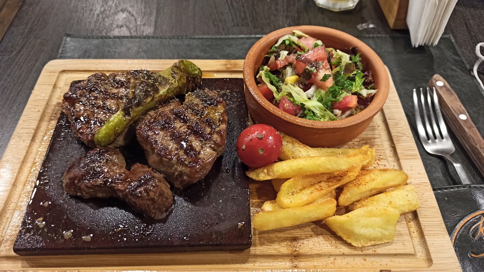 The menu features classics like köfte (meatballs), hamburgers, and döner, each prepared with special attention. The köfte, served on hot stones to ensure they never cool, are elevated by a delicious blend of cheddar and kashar cheese. The Special Kasap Burger, a masterpiece crafted by expert hands, greets you with its irresistible aroma right at the entrance. Fresh beverages, such as homemade lemonade, perfectly complement the meal. The staff is attentive and hospitable, and the portion sizes are generously satisfying.
