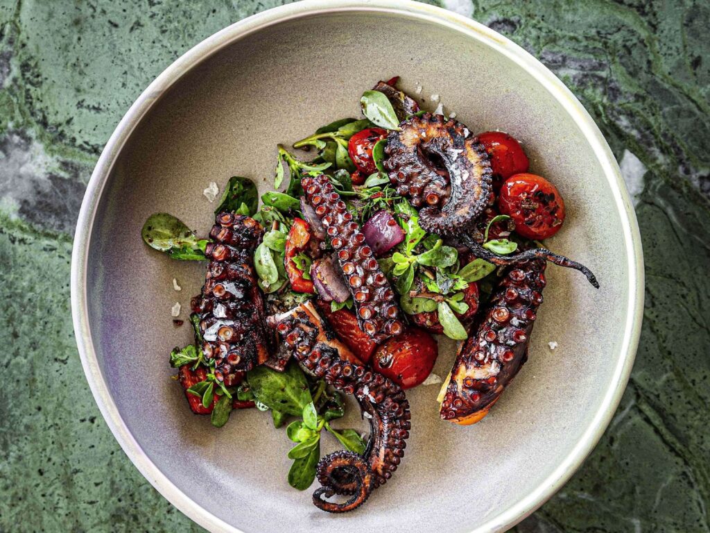 Mutfakta özellikle deniz ürünleri ön plana çıkıyor. Kalamar, ahtapot ve levrek gibi ana malzemeler, ilham verici pişirme teknikleriyle sunuluyor. Başlangıçlar çeşitliliği ve lezzeti ile dikkat çeken kuru cacık, kereviz ve sarmaları denemenin yanısıra, kuzu ana yemeği restoranın imzası niteliğinde. Sebzeyi ön plana alan yaklaşım, her tabağa derinlik ve denge katıyor. Tatlar uyumlu, sunumlar özenlı ve detaylar düşünülmüştür.